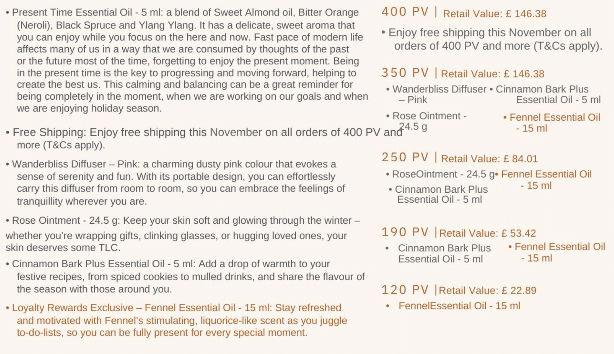 Orders of 100PV and above earn free products through the Gift with Purchase each month. The GWP changes monthly and is only available for that specific month.